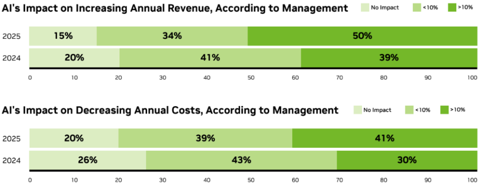 - 85% 的高階主管表示AI有助於提升營收,80% 認為AI有助於降低成本。