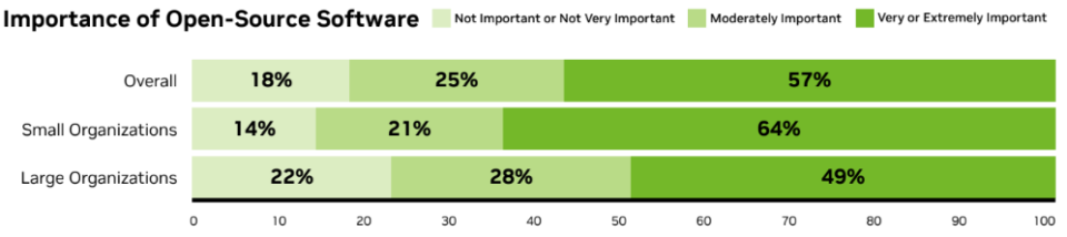- 82% 的受訪者認為開源軟體與模型對其組織的AI策略而言具有中度到極高的重要性。
