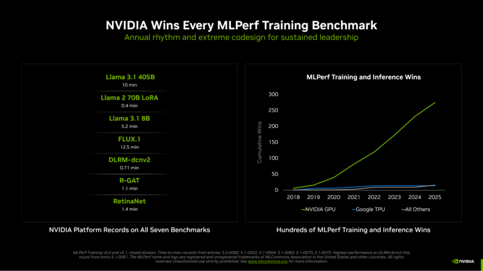 NVIDIA在MLPerf Training v5.1中橫掃全部七項測試,於大型語言模型(LLM)、圖像生成、推薦系統、電腦視覺和圖像神經網路等領域均創下最快的訓練速度。MLPerf Training v5.1為持續多年舉辦的AI訓練效能業界基準測試中最新一輪。